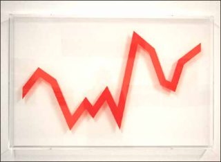 Sur le mur du fond, l’artiste a accroché un smiley gigantesque, sorte de soleil flamboyant qui d’habitude porte sa bonne mine en bandoulière. Le voici au contraire figuré avec le sourire à l’envers, traînant sa peine alors même qu’à côté les cours de la bourse (en fait, la cote de Robert Rauschenberg sur le marché de l’art) semblent repartir en hausse.