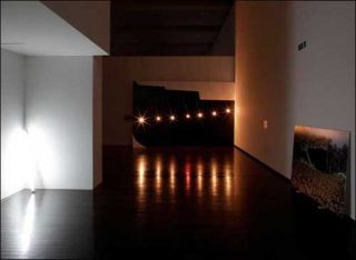 Le noir n’est pas total. Les fenêtres sont occultées, les lumières habituelles éteintes, mais Alain Bublex les remplace par quelques sources lumineuses précaires, spots de chantier ou néons bruts braqués sur des murs vides. Le Mac/Val est ainsi plongé dans une atmosphère entre chien et loup qui donne une impression de mise en veille, de temps suspendu.