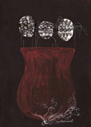 Dans ces petits cadres, des dessins, ou plutôt des collages, ou plutôt de petites peintures… Non, décidément, il est difficile de savoir à quoi on a affaire, tant les formes sont hybrides et mêlent les supports. Mais, une chose est sûre, un univers se cache là , dans ces esquisses, un petit monde fantastique fait de visages de femmes échevelées, d’escaliers, de mains, d’œufs…