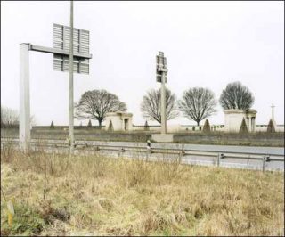 Plus largement, Aymeric Fouquez s’intéresse à la manière dont cet élément récurrent qu’est le cimetière militaire s’intègre à son environnement et peut le modifier. Abrité par un enclos, il constitue une sorte d’îlot fermé sur l’extérieur. Parfois, perdu au milieu des champs, il n’est même plus accessible. Ailleurs, il est coincé entre une route et une façade couverte d’enseignes. Il finit écrasé par un environnement qui semble entièrement dominé par des contraintes économiques.