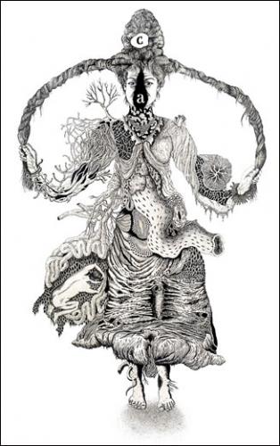 Les dessins à l’encre de chine nous replongent avec joie et frissons dans une iconographie originale emplie de personnages inquiétants, écorchés et hybrides à la fois. Ceux à la pierre noire grasse, poétiques à souhait, évoquent l’univers onirique de contes fantastiques.