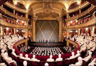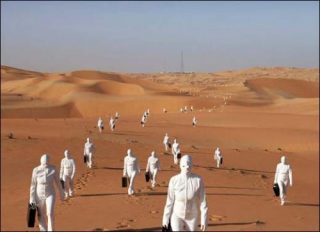 Chez François Ronsiaux, l’absence prend la forme d’une présence masquée. Dans 28ème parallèle, les figures en combinaison de latex envahissent les décors du monde globalisé — salles de meeting, hôtels d’affaires — et hantent les technocrates qui les peuplent. S’agit-il d’une vraie révolte, ou d’une simple levée de clones, blancs de toute intention?