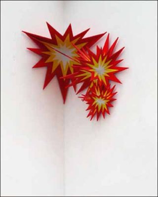 — Une étude des étoiles, 2003. Technique mixte : acrylique, drapeau américain, capsules. 85 x 70,5 cm.