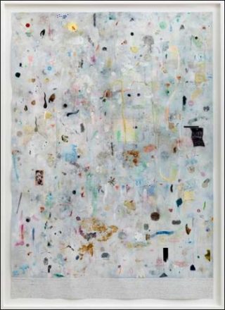 «Simon Evans ébauche sciemment des algorithmes qui échappent à toute forme d’application, à toute possibilité d’exploiter ses collections d’informations. Il a récemment commencé à travailler de manière abstraite, en utilisant une abondance de papiers trouvés, qu’il rassemble en images aux allures de vastes paysages (Big Ghost, The Skin of the Earth is a Blue Blouse…); cet aboutissement conceptuel à une carte quasi vide peut être envisagé à la lumière de la formule si bien trouvée de Guy Debord en 1959: «Tout jeu se déroule dans les contours de son domaine spatial.» Ou, comme Evans le dit lui-même: «Une parodie d’un délire de toute puissance est encore un délire de toute puissance. Je mettais une marguerite dans le canon de la carabine et maintenant je m’en vais. Je pars vers le champ où poussent les marguerites.» (Elodie Evers, «Toward Where the Daisies Are», in Simon Evans, monographie publiée par Kerber Verlag (Berlin), 2014)