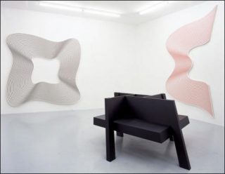 Dans ses toiles, Philippe Decrauzat s’inspire principalement des dessins d’Etienne-Jules Marey, père de la chronophotographie, et plus particulièrement des courbes issues de l’observation des phénomènes respiratoires, qu’il retravaille ensuite pour générer des trames simples. Le rythme de la succession de diagonales parallèles sur ses toiles produit des effets ondulatoires. Les volumes, quant à eux, par leurs dimensions imposantes, perturbent l’espace d’exposition à la fois visuellement et physiquement.