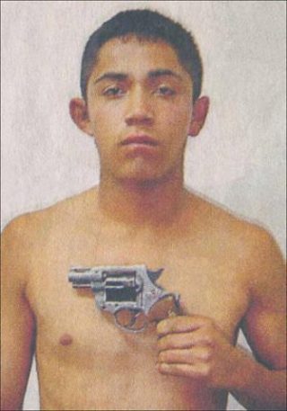 La série photographique Boyzone – Mexico D. F., qui ouvre l’exposition de Clarisse Hahn, suggère la possibilité d’un renversement de cette esthétique de la peur. Pour ces photographies, qui font partie d’un projet plus large auquel elle travaille depuis maintenant plus d’une dizaine d’années, l’artiste a approprié des photographies trouvées dans la presse à Mexico. Il s’agit de photographies d’hommes prises par la police ou par des journalistes au moment de leur arrestation, puis publiées dans des journaux locaux. On y voit des jeunes hommes, gangsters et criminels souvent pas encore adultes; ils regardent fixement l’objectif, parfois en prenant la pose, comme ce garçon — Jesus — qui tient son pistolet déchargé contre sa poitrine, parfois on les force à montrer leur visage à la caméra, comme dans la photographie qui porte la légende Gangster. Cette dernière image montre en particulier toute l’ambivalence entre menace et mise à nu qui apparaît comme constitutive de cette série. L’opposition entre le cuir noir de la main gantée du policier et la peau encore imberbe du visage de l’adolescent offert au regard du photographe cristallise cette ambivalence. Ce qui est exposé en tant que menace apparaît fragilisé dans son apparence enfantine et livré à un pouvoir «adulte».