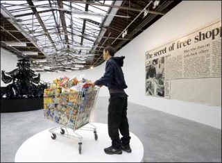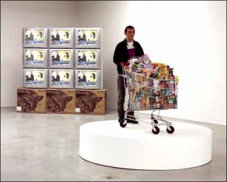 Exploitant les travers de la société de consommation, il a vécu gratuitement en achetant des produits «satisfait ou remboursé». Il dévoile donc au grand jour sa méthode mais se transforme aussi en matériau malléable par les médias qui récupèrent son image. La statue campée sur cet étrange podium est là pour nous interpeller sur le réel statut de l’artiste. Doit-il se mettre sur un piédestal ou dénoncer les choses plus radicalement?