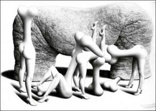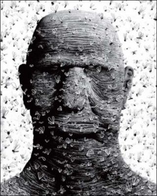 Les créations en noir et blanc ont en commun de se nourrir, quasiment au sens propre du terme, d’éléments de corps humains. Associant de simples silhouettes très lisses et blanches à des fragments sombres à la matérialité palpable — formes charnelles indéfinies, visages encombrés d’une peau excessivement plissée —, ces dessins décrivent une humanité partagée entre désincarnation artificielle et authenticité biologique vouée à la décrépitude. Ainsi le dessin Lit qui est composé d’une fine paire de jambes féminines à l’aspect androïde et à talons hauts, associée à une masse de chair ridée aux replis flasques. Ailleurs, une tête entourée de mouches évoque une décomposition déjà à l’œuvre…