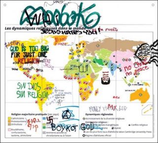 A l’envers de ces images architecturales se trouvent disposées quatre cartes couvertes de tags enragés. Les œuvres d’Yves Buraud ne se contentent donc pas d’évoquer la géographie, l’urbanisme et les espaces contemporains, et se chargent d’une portée politique, historique et sociale évidente. Les cartes scolaires, abordant des sujets de société (religion, police, code vestimentaire des femmes…) se trouvent souillées de graffitis, d’insultes racistes, de slogans anarchistes, nihilistes ou nazis. Elles semblent ainsi servir de déversoir aux frustrations morbides et aux pulsions destructrices de l’humanité.