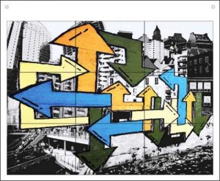 Les cartes d’Yves Buraud opèrent surtout un télescopage entre des panoramas relativement banals d’architectures urbaines (tours, ghettos, banlieues pavillonnaires), et des graphismes plus abstraits, colorés, géométriques ou décoratifs. On y découvre aussi bien Drancy, Chantennay, Saint-Malo ou Boulogne, que des motifs évoquant Josef Albers, l’art optique, le Bauhaus, ou plus étonnant encore, des tapisseries, des pixels d’écrans de jeux vidéo, ou même des flèches numériques rappelant nos systèmes de navigation (type Mappy ou Tom-Tom). Ces clichés d’architectures urbaines anonymes et standardisées se trouvent ainsi dynamisés, explosés par les interventions plastiques de l’artiste. Les panoramas des villes aux tons pastel et grisâtres s’emboîtent dans des blocs de couleurs, dont l’assemblage, au final, s’harmonise ou crée au contraire des contrastes violents. Par là Yves Buraud enchante des espaces de banlieue réputés pour leur soi-disant morosité, ou souligne l’aliénation sociale inhérente à ces sites.