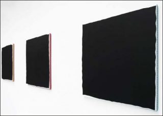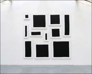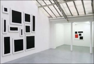Pour cette nouvelle exposition intitulée Nouveaux standards, Nicolas Chardon a choisi de faire dialoguer les Å“uvres récentes avec des peintures du tout début de sa carrière comme une manière d’affirmer la position d’un travail de peinture avec une même clarté de méthode. Bien entendu on retrouve sa marque de fabrique, ses «Carrés noirs», avec un ensemble de 3 «Carré maximum» sur tissu vichy jaune, rouge, ou bleu, où la forme noire occupe quasiment toute la toile de manière à ne laisser qu’un liseré blanc à son pourtour.