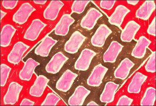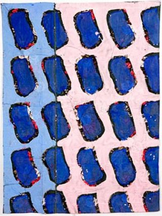 Viallat commence ainsi à travailler sur des bâches industrielles, libres de tous châssis, sur lesquelles il répète à l’infini une même forme abstraite. Cette «forme» qui peut évoquer tour à tour un osselet ou une main est devenue au fil du temps sa signature. Répété au pochoir, de couleurs variées et sur des supports divers (tissus d’ameublement, tapis, matériaux de récupération), ce motif, qui annihile la notion de «sujet», permet à Claude Viallat de mener une réflexion sur le sens du geste créatif et le statut «d’œuvre d’art».