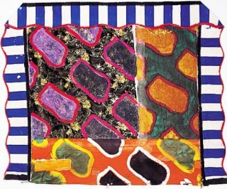 Pour cette nouvelle présentation, Claude Viallat décline le motif devenu sa signature sur des tissus imprimés. Recouverts d’étonnants graffitis, de textes publicitaires superposés, de points ou d’ornements, ils offrent une vertigineuse mise en abîme du principe de répétition cher à l’artiste. Ce systématisme, associé aux couleurs artificielles, à la texture brillante et à l’aspect commercial de certains supports — foulard, nappe de Noël — font un écho inattendu aux créations du Nouveau Réalisme ou du Pop Art.