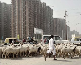 Chaque cliché renvoie au caractère incontrôlé de l’urbanisation de New Delhi, la vision à court terme et violemment contemporaine qui la guide. Les photographies de Johann Rousselot jettent la lumière sur des paradoxes criants. Ainsi cette image d’un berger accompagnant son troupeau au milieu de la circulation et au pied de hautes tours modernes. Ce reflet du chaos et de la précarité générés par le développement rapide de municipalités où les promoteurs immobiliers rachètent peu à peu les terres agricoles s’oppose à l’image de Jayant, agent immobilier de 41 ans photographié en train de s’amuser avec sa femme et ses enfants sur une aire de jeu.