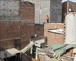 Une photographie de la colonie illégale de Tughlakabad Extension.témoigne de l’existence de ces colonies illégales qui occupent la plupart du temps des terres réservées à l’agriculture et dans lesquelles vivent quatre millions de personnes. Sur une autre, on découvre un campement d’une grande pauvreté, perdu au milieu d’un paysage hivernal et désolé, près d’une voie rapide. Les quelques baraques précaires sont bâties sous un large panneau publicitaire dédié à la promotion de logements dans des immeubles modernes du centre de Dehli.