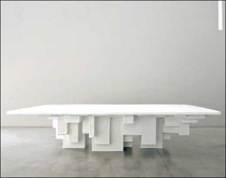 Le rendu apparent de la surface est intriguant, lisse et imparfait à la fois, la douceur du toucher renvoie à l’idée d’une peau. La technique sert une volonté esthétique, mais aussi une exigence de création artisanale, la main agit sur le revêtement alors considéré comme un vêtement. Chaque pièce est envisagée comme une pièce unique, conçue sans l’usage de la machine. Sur une structure cartonnée en nid d’abeille, les designers posent un linceul de résine époxy non-toxique blanche. Comme un masque liquide mis en forme sur des volumes, les meubles semblent émerger. La blancheur, cette non-couleur, est une mise en abime de la vision, la matière semble présente et absente à la fois, seules les imperfections révèlent les traces du travail artisanal et retiennent le regard. Primitive est un mobilier souple et sensuel, que Nucleo propose pour l’intérieur ou l’extérieur, la résine blanche, sophistiquée et technique, étant d’une virginité inaltérable.