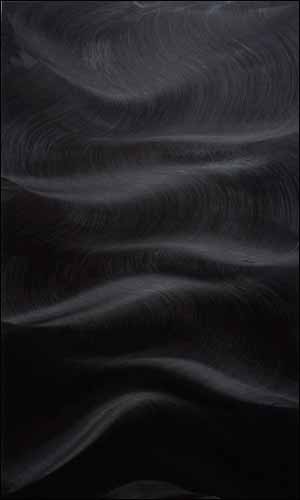 Le support est une arène, travaillée aux dimensions du corps. Pour les plus grands formats, Jason Martin est monté sur une échelle, redescendant progressivement tout en se contorsionnant pour comprimer la matière avec le peigne. Des stries extrêmement fines et resserrées biffent la surface, creusant dans le frais de la peinture des sillons où vient s’accrocher la lumière.