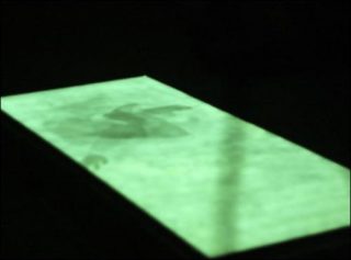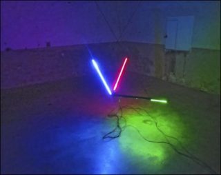 Laurent Chanel manipule à distance un axe xyz. Trois dimensions pour trois couleurs: rouge vert bleu, le code RVBqui sépare les trois composantes des couleurs. Sur la bande sonore de Dawn of the dead de Georges A. Romero, cet OVNI minimal métamorphose la colorimétrie du lieu qui l’accueille