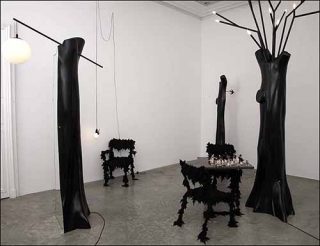 José Lévy crée un véritable univers bucolique, teinté d’une ironique noirceur. Sa source d’inspiration : le jardin du Luxembourg qui, la nuit, transforme les arbres en ombre. Comme eux, les meubles sont réduits à l’état de silhouette, appréhendés seulement dans leurs contours, ce qui donne à l’ensemble cette sobriété formelle (et le préserve d’une connotation kitsch). Contre le mur, le fil reliant l’ampoule à sa source d’alimentation dessine un M et fait, seul, office de corps et de décor au luminaire, exemplaire de ce refus du superflu. La couleur, neutralisée, laisse toute la place à la lumière — clarté lunaire reflétée dans le miroir de The Chinese Lantern Mirror ou absorbée, au contraire, par la flaque de Shadow in Water.