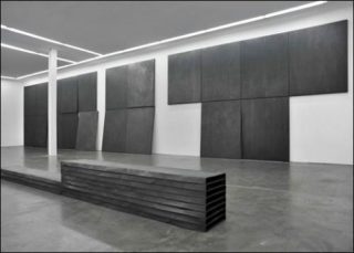Nous découvrons ensuite un pan entier de mur où se trouvent accrochés des modules gris de même taille, réunis en différents ensembles. Ces monochromes sont montés sur des châssis, certains sont disposés bien à plat contre le mur, d’autres baillent un peu, se décollent, débordent, ou se trouvent posés de biais sur le sol et se reposent alors contre le mur de la galerie, présentant ainsi des surfaces obliques sur lesquelles se réfléchit la lumière.
