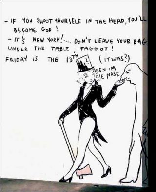 Ce qui frappe d’ailleurs dès le premier regard, une fois entré dans la salle, c’est le poids quasi politique que paraissent contenir — mystérieusement — chacune des peintures proposées. À gauche, ouvrant l’exposition, l’œuvre Funeral, marquée de ses croix noires et blanches, présente une scène d’enterrement, des personnages voilés défilant pour on ne sait quel hommage. Plus loin, ce sont les deux guerrières qui ressurgissent, cette fois sur un fond bleu-vert sombre et chaotique, toujours plus énigmatiques. À droite, un visage grimaçant, comme tracé rapidement sur la toile, camoufle un texte écrit sur le mur, laissant peu d’indice à sa compréhension. Au fond enfin, l’artiste a peint une femme en haut de forme et queue de pie, se promenant manifestement gaiement une hache à la main, et traînant de l’autre, par le bout du nez, un drôle de personnage masculin, le tout étant complété par un étrange dialogue parlant de Dieu et de New York…