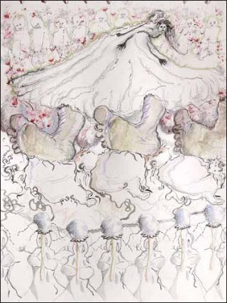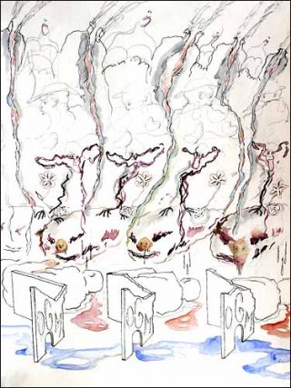 L’espace environnant est comme dynamité: les sapins de noël volent et les personnages flottent dans une atmosphère épaisse traversée par de grandes volutes grises. L’image dont les contours se font hésitants, se dérobe. Les formes se dispersent et créent des méandres dans lesquels le regard se perd.