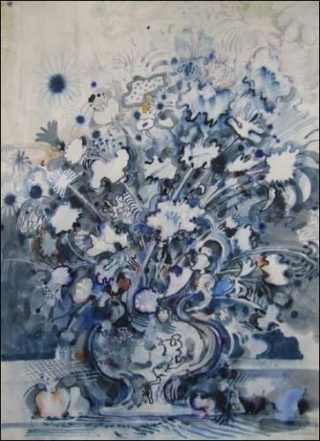 David Scher est un artiste fantasque qui s’accorde toutes les libertés sans se soucier des «qu’en dira-t-on». Souvent, il franchit les limites du possible pour nous entraîner dans un univers proche du kitsch. Dans ses dessins, on retrouve ce même esprit étrange et cet humour si particulier: une série de vases, réalisée à l’aquarelle bleu de Delft, comme un pied de nez aux compositions florales des peintres hollandais; des cyclistes échappés du tour de France, en grande difficulté ; ou des grands livres ouverts, tachés, à la manière d’un dripping.