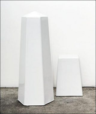 Nous rencontrons ensuite deux sculptures blanches, posées à terre, dont les formes font écho à des pylônes scandant les trottoirs de nos villes, et nous voilà désormais convaincus que notre chemin, au premier abord si tortueux et discontinu, suit en réalité une certaine logique.