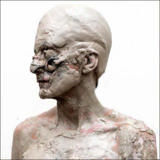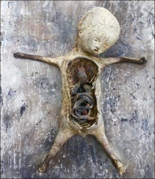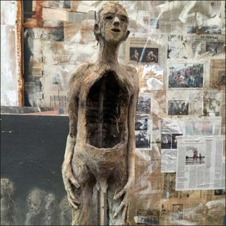 Une sculpture constituée de bois, d’argile et d’autres matériaux organiques représente le corps d’un bébé, membres écartés et torse ouvert dévoilant ses entrailles. Une autre figure, un homme debout, se tenant droit, les bras le long du corps, la bouche comme entrouverte sur un cri, le ventre également ouvert mais creux. Telle une plongée sur un incommensurable vide intérieur.