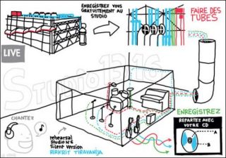 «On Air» est la nouvelle programmation estivale du Studio 13/16. Dans cet espace unique en son genre, spécialement dédié aux adolescents, l’artiste Rirkrit Tiravanija invite à «jouer» de plusieurs territoires de création: la musique, le live, la performance. Véritable studio de répétition et d’enregistrement, équipé de deux guitares électriques, d’une basse, de quatre micros et d’une batterie, cette installation, transparente mais isolée phoniquement, permet à des musiciens en herbe ou confirmés d’y enregistrer gratuitement, sur réservation, pendant 60 minutes, aux heures d’ouverture du Studio 13/16.