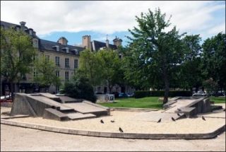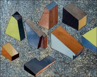 Dans la ville de Caen, Séverine Hubard a repéré les lignes et les formes «discontinues» de la fontaine en béton, aujourd’hui inactive, de l’artiste sculpteur Gérard Mannoni au sein de la place de la République qu’il a modelée dans les années 1970. Intriguée et conquise, elle en propose ici une maquette à échelle 1/2. Elle en reprend formes et volumes en grandes planches, plateaux de table en formica, armoires laquées puisés dans les stocks d’Emmaüs. Ces différents modules assemblés tel un jeu de construction, forment entre eux une nouvelle sculpture, à la fois réactivation de la fontaine abandonnée et patchwork de couleurs données par le mobilier récupéré.