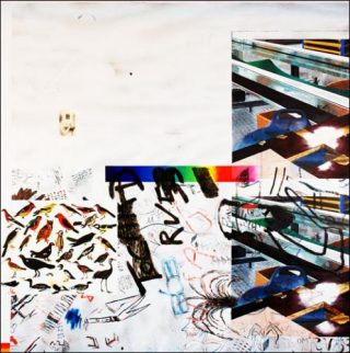 Ailleurs, la même machine, vue sous un autre angle, est surmontée d’étranges cartes à jouer. Une nuée d’oiseaux voisine avec une chaîne de montage. Les Scrapbooks de William Burroughs où l’écrivain consignait les photos de presse qu’il découpait et celles qu’il prenait, en sentant que de leur juxtaposition un sens jaillirait pour lui seulement, procèdent d’un rapport similaire entre extériorité et imaginaire, désuétude et mémoire, zones d’images explicites et terra incognita de la peinture.