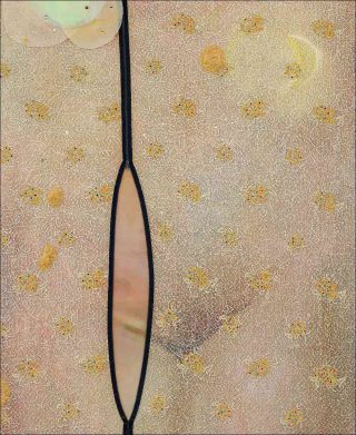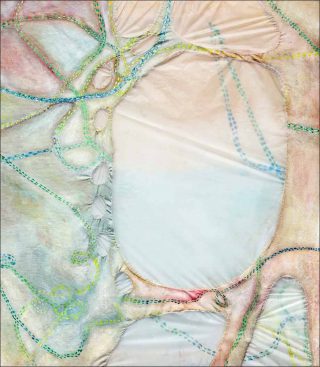 L’exposition « Onjes-sur-Joult » de Mathilde Ganancia comprend plusieurs tableaux faits à partir d’un assemblage de matériaux : tissu, broderie, fermetures éclair, plastique, épingles, bâches – le tout recouvert de peinture à l’huile. L’artiste joue ainsi sur les textures, les couleurs, la brillance, mais aussi sur les motifs qui se déclinent en petits points, en vagues ondulantes ou encore en oiseaux colorés. Ces mélanges aiguisent le plaisir de voir et le désir de toucher, et procurent une vivacité et une sensualité toute particulière à ces toiles.