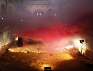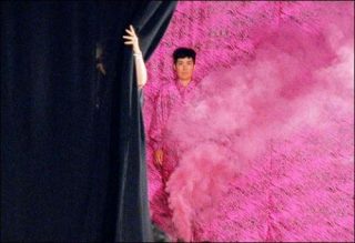 Quand le rideau se lève, un autre apparaît. Celui-ci, zébré de rose, mélange la technique du camouflage militaire avec l’élégance des tenues gay, et met en valeur la grande quantité de fumée qui en sort. Cette fumée dense vient peut-être des bombardements, ou est un signal lancé lors d’une manifestation politique.