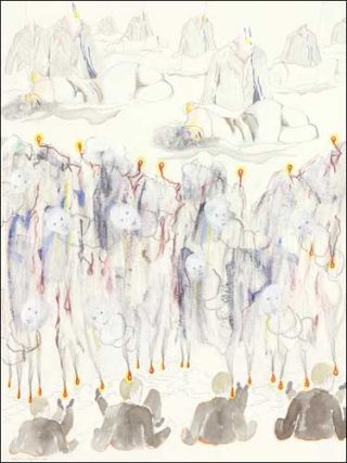 Ses dernières sculptures, toujours réalisées à partir de peluches transies dans de la peinture et d’accessoires assez sommaires comme des tables ou des bougies, sont porteuses d’images fortes qui répondent à son jeu permanent avec nos joies et nos peurs enfantines.
