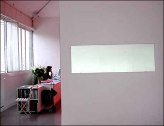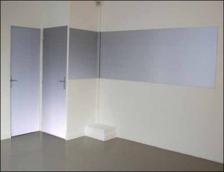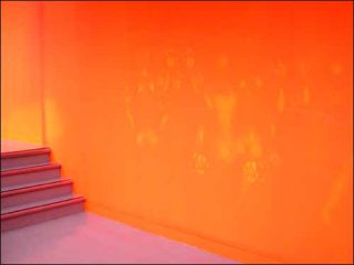Tour à tour naturelle et artificielle, cette lumière se joue des variations. Un mur de la galerie, qui fait face à la baie vitrée, est intégralement recouvert d’une couche de peinture thermosensible. La surface, à la planéité désormais instable, change de couleur sous la double action du soleil qui l’éclaire et la chauffe, et des visiteurs qui la touchent comme pour vérifier (Orange, 2003). La couleur ne délimite plus le mur. La frontière est brouillée entre cette surface plane, notre déplacement, et l’environnement aérien et impalpable de l’espace d’exposition.