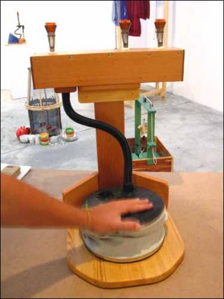 On retrouve en fait dans cette exposition l’empirisme forcené de Kersels qui, par le caractère ludique et bricolé de ses instruments, déplace l’attention du spectateur sur leur logique de fonctionnement. Dès le début des années 90, l’artiste expérimentait par une série de performances loufoques des cas de figures d’ordre physique par lesquelles les notions de poids, vitesse, espace et temps sont devenues la matière même de son travail. Il continue aujourd’hui à en explorer les possibilités.