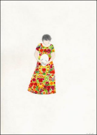 Les travaux réalisés à Budapest sont ceux qui dégagent sans doute le plus de fragilité et d’allusions personnelles: un foetus dessiné dans les détails d’une robe à motifs rouges, une femme serrant contre elle un oeuf, un bébé dessiné aux côtés d’une femme vêtue d’une robe verte ample.