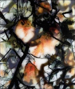 Un cadrage serré combiné à l’épaisseur opalescente du verre permettent au spectateur de ressentir la présence de l’arbre par des effets vibratoires et veloutés: Les ombres transparentes, les dégradés de tons, la nuance éthérée des fleurs s’opposent à la calligraphie des branches noires. Ce contraste se dilue dans un enchevêtrement visuel qui nous éloigne de plus en plus d’une représentation figurative. L’alchimie fusionnelle du verre et de la couleur harmonise le regard vers une abstraction «atmosphérique» au plus près de l’essence de l’arbre.