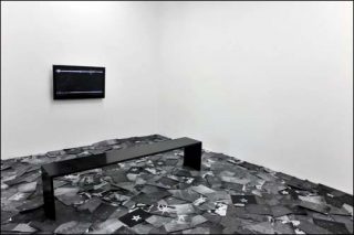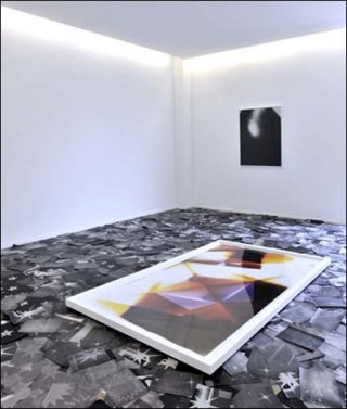 La fenêtre ensoleillée de Walead Beshty, posée à même le sol, renvoie ses éclats prismatiques aux teintes chaudes sur la blancheur, la noirceur et la grisaille ambiantes des supports et des surfaces exposées. Les pliures ne sont pas représentées par la technique habituelle du peintre hyperréaliste mais imprimées directement sur une grande feuille de papier photo à sensibilité relativement faible ou lente, au moyen de la lumière du jour. C’est un photogramme coloré.