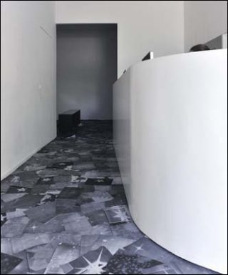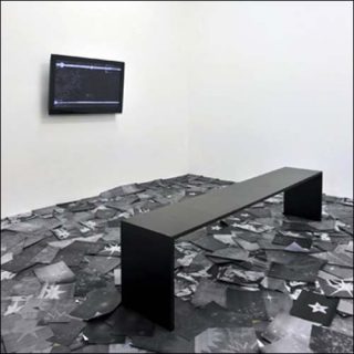 Par ailleurs, les icônes sont plus ou moins fixes. Les feuilles mortes jonchant le sol, des centaines de photocopies 21 x 29,7 aux motifs stellaires, installation de Pierre-Olivier Arnaud, vibrent au gré des pas des visiteurs —impossible de faire autrement que de fouler au pied ces ciels qui se reflètent sur le plancher de la galerie.