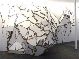 Symboles de l’éphémère, du jetable, de l’ère du déchet, ces mégots, associés à l’espace public, politisent le propos de l’artiste en renvoyant à la précarité de nos sociétés. Une précarité qui transparaît dans l’effacement progressif du trait de crayon de Tradition of Excellence, coupe topographique d’un idéal ordinaire : maison individuelle, lac, espace. D’apparence commune, naïve, cette architecture domestique dévoile une infrastructure improbable — un escalier qui descend en strates longitudinales dans les profondeurs de la terre —, ce qui donne à penser à l’impossibilité de ce rêve «foncier», aussi élémentaire soit-il.