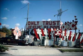 La saturation visuelle, que génère la proximité de Meyerowitz qui fait corps avec le flux urbain, provoque aussi des effets de collage. Piétons, automobiles, édifices de verre, et églises néogothiques sont assemblés sans épaisseur, juxtaposés et disjoints, comme dans un décor de carton-pâte (New York, 1975). Et comme Evans, Franck, Friedlander, Shore, et bien d’autres, Meyerowitz sillonne les Etats-Unis, capturant au vol —From the Car, comme le mentionnent les légendes—, les visions fugitives pré-formatées, que lui offrent les écrans vitrés de son automobile.