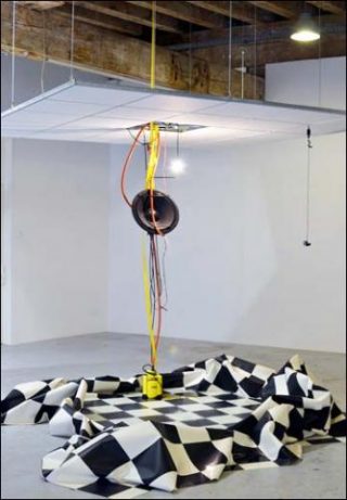 Cette capacité à extraire de l’apparente banalité et de la standardisation du monde son étrangeté constitutive, sa violence normative, est l’une des clés de lecture de l’exposition. Quoi de plus omniprésent et par conséquent invisible, que des faux plafonds? S’ils servent à cacher les entrailles techniques qui font fonctionner des lieux administratifs, industriels ou commerciaux, ils sont surtout des matériaux idéologiques permettant d’uniformiser les espaces et les consciences en faisant passer l’autorité de la norme comme une évidence. À la diversité des espaces, comme le plafond en bois de la galerie qui témoigne d’une ancienne activité de menuiserie, se substitue l’idéologie du neutre, de l’espace anonyme, global et homogène. Ce principe de la grille, extensible au lino, est une modélisation renvoyant à la fois à différents codes culturels (l’échiquier, le pixel) et artistiques (art cinétique, minimalisme) mais correspond surtout à une économie politique du design, une vision utilitariste et normée du monde.