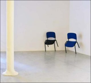 Dans un coin de la galerie, deux chaises «visiteur», archétypes du monde administratif et entrepreneurial, deviennent des outils de renversement du regard. Le geste le plus élémentaire associé à l’un des objets les plus génériques, issu du monde bureaucratique, a un potentiel fabuleux de passer inaperçu. Adossées au mur de façon identique, mais dans des sens différents, les deux chaises créent une perturbation du regard qui ne permet pas de distinguer dans quel sens elles sont posées. Une, voire trois chaises signalent une disjonction mentale, faisant apparaître une troisième chaise fabriquée par la vision.