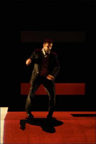 Les propositions en matière d’éclairages se montrent aussi très astucieuses. Il y va du jeu subtil entre la lumière du projecteur qui garde toute son intensité et l’atmosphère ambiante, laissant surgir dans l’obscurité environnante des masses corporelles. Il y va également de la consistance parfaite de l’ombre des corps projetée sur l’écran qui devient triple support : de l’image projetée, du corps du danseur, de son ombre qui a la même consistance que le personnage prenant forme dans les mouvements de l’encre, se faisant ombre aussi, ou grande tache informe toujours à la recherche d’un visage. Il y va aussi d’une séparation nette entre différents plans de la scène, ce qui donne à ce corps unique et schizophrène, formé des corps de deux danseurs, toute la puissance d’une image refoulée, enfouie dans les tréfonds de l’imaginaire. Un éclairage oblique fait ressortir toute l’étrangeté d’un buste d’homme et de sa tête — mimiques grotesques, grimaces, nœuds dans les muscles et un corps tout fait de tensions. Et une fois cette image inquiétante installée, une lumière frontale et neutre nous donne le revers de la médaille, et permet le retour peu rassurant de la situation : le même homme épuisé par un combat sans répit avec son double intérieur.
