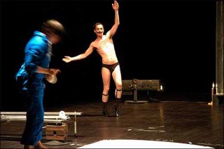 La danse s’introduit en tout cela de manière insidieuse, elle est là où on l’attendait le moins, et finalement, elle est partout. Sylvain Prunenec la cherche avec des gestes étudiés, savants. Un mouvement parasite s’introduit dans cet enchaînement de postures classiques, alors que son partenaire l’avait naturellement trouvée, dès son entrée en scène, dans une danse d’ivrogne, désarticulée, avec des membres rigides et des points d’équilibre très improbables, dans une déambulation hasardeuse qui passe d’un équilibre de fortune à l’autre.