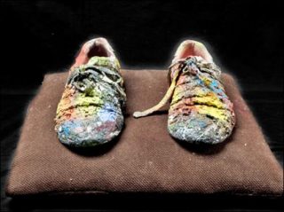A l’image d’une palette de peintre, les chaussures exposées de Julien Friedler sont une œuvre autobiographique, témoignage d’une création artistique exacerbée qui laisse apparaître d’épaisses strates de peintures multicolores.