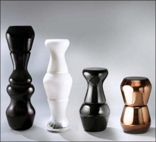 Nées de la rencontre du sable et du feu, ces Métamorformes de verre et de lumière doivent autant au souffle de l’artisan qu’au savoir-faire du maître verrier. C’est à partir de trois éléments en verre soufflé, et métallisé pour certains, que Sacha Walckhoff a composé ces quatre nouvelles pièces pour la galerie Gosserez. Le designer a voulu faire de ces créations opaques et miroitantes à la fois des stèles, des assises, des colonnes ou des sculptures. Ces pièces aux courbes différentes, aux reflets multiples et aux couleurs diverses (noir, cuivre et blanc) ne cessent de dialoguer entre elles et de se métamorphoser dès que l’on pose le regard sur elles.