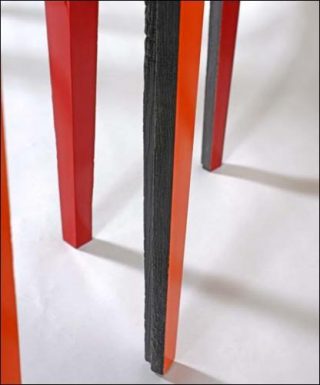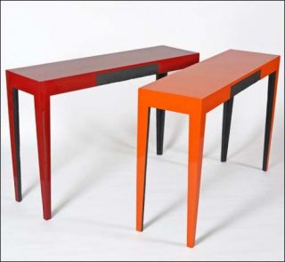 Les consoles Phoenix, dernière réalisation de Neil et Annabel Mc Carthy, associent la laque au bois brûlé. Les créateurs ont fait subir au chêne massif le traitement par les flammes, ou shou sugi ban, une technique japonaise consistant à calciner le bois en surface afin de le rendre résistant. La texture mate des surfaces noircies de la console contraste ainsi avec l’aspect lisse et brillant des surfaces laquées. Ce triptyque a été imaginé suite à l’incendie qui a ravagé le cottage irlandais dans lequel le designer Joseph Walsh, ami des Mc Carthy, a établi son studio de création. La vision du bois calciné et le souvenir d’un vaisselier traditionnel réduit à néant par les flammes ont inspiré Phoenix à ses deux créateurs.